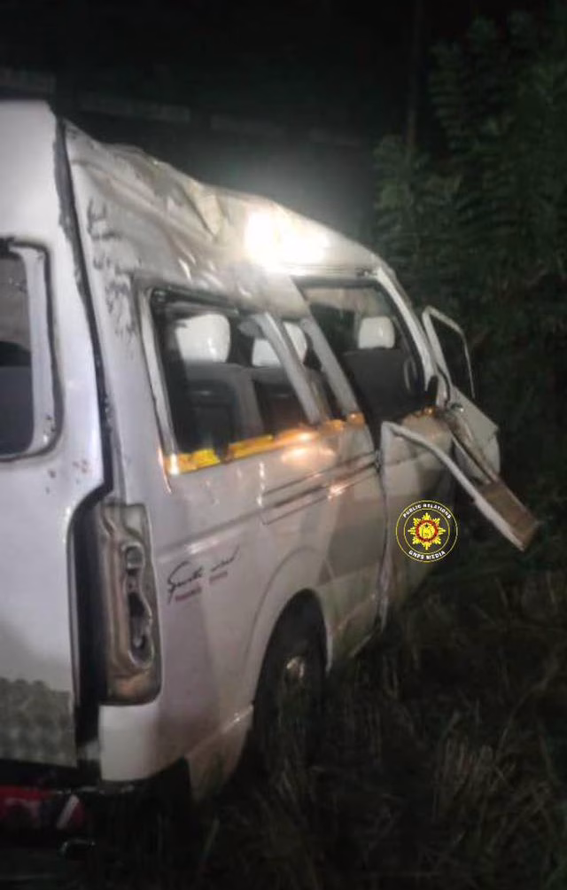 The crash occurred around 4:16 a.m., while the vehicle was en route from Takoradi to Kumasi. The cause of the accident remains unclear, but the white sprinter bus was severely damaged upon impact.