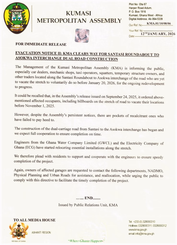 The Kumasi Metropolitan Assembly (KMA) has issued a second evacuation notice to occupants along the Santasi Roundabout–Asokwa Interchange corridor, instructing them to vacate the area by January 20, 2026 to facilitate ongoing road construction works.